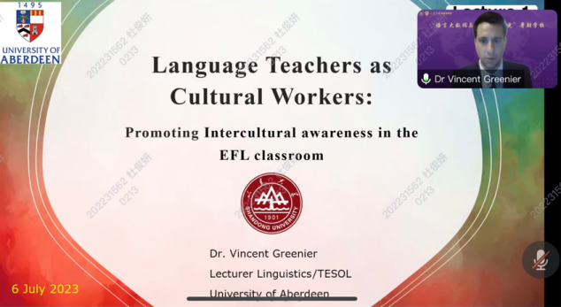 7月6日至7月12日,阿伯丁大学Vincent Greenier博士相继带来了“Language Teachers as Cultural Workers: Promoting Intercultural awareness in the EFL classroom”、“Creative translanguaging in formative assessment: Innovative assessment practices in times of change”、“Advancing a culturally situated conceptualization of creativity in the Chinese EFL classroom”的语言教学系列讲座,讲述了英语教师如何在教学中构思跨文化意识,梳理了基于中国英语教师半结构式访谈展开的数据分析研究,并强调教师对于创造力的概念化教学至关重要。通过交流,学员们对教师的角色定位、语言测评中的超语实践、以及语言教学中的创造性都有了深入了解,讲座的跨文化视角也为语言智能背景下的语言教学提供了更广阔的视野。
