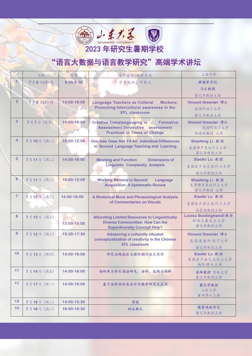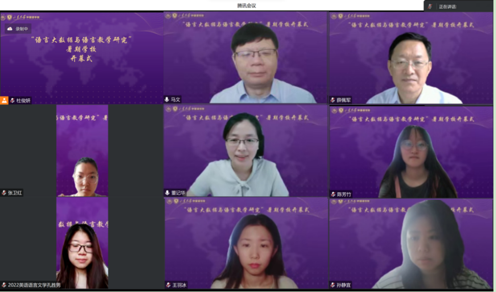 7月6日至7月18日,威尼斯7798cc成功举办2023年“语言大数据与语言教学研究”国际暑期学校。本次暑期学校以“语言大数据与语言教学研究”为主题,邀请美国宾夕法尼亚州立大学Xiaofei Lu教授、美国佛罗里达州立大学Shaofeng Li教授、新西兰大学Louisa Buckingham副教授、英国阿伯丁大学Vincent Greenier博士、吉林大学姜峰教授和威尼斯7798cc董记华教授六位知名学者,共进行11场前沿讲座,旨在提高语言学大数据与语言教学研究人才培养质量和科研创新能力,促进国内外高校师生的交流与合作。来自全国十余所高校的52位教师和研究生学员参与了本次暑期学校。