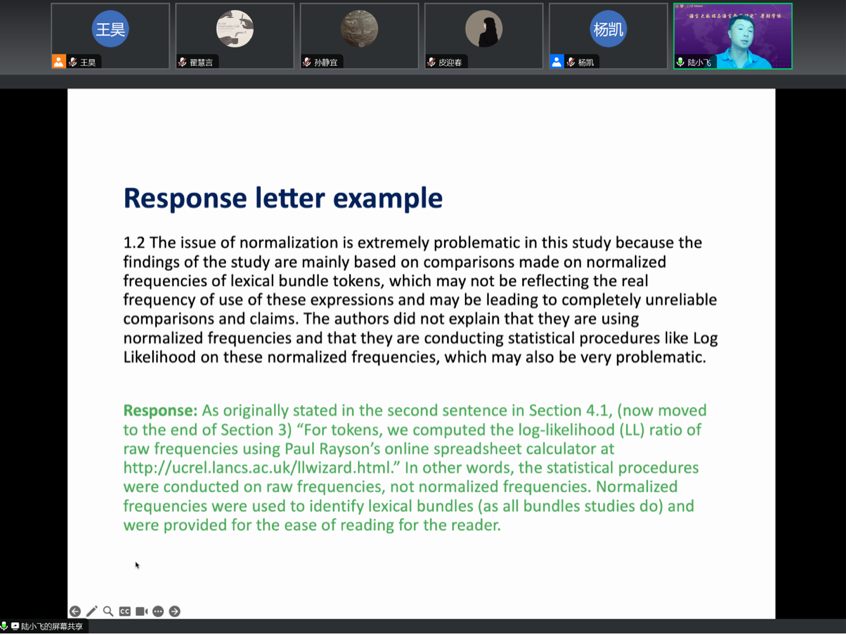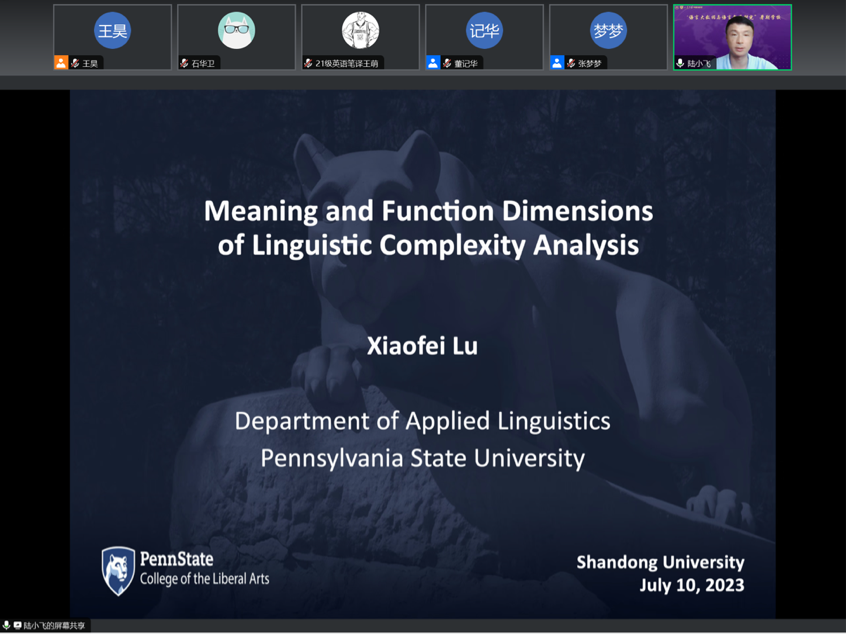 7月10日至7月13日,宾夕法尼亚州立大学Xiaofei Lu教授相继带来“Meaning and Function Dimensions of Linguistic Complexity Analysis”、“A rhetorical move and phraseological analysis of commentaries on visuals”、“研究话题选取与国际期刊论文写作”的讲座,讲座论证了语言复杂度分析中意义与功能维度的重要性,阐释和解析了视觉评论在跨学科的学术写作中的作用。同时,Xiaofei Lu教授结合自身多年来开展跨学科合作研究以及国际期刊论文写作、修改、发表和审稿的经验与实例,为大家分享和解析了研究生应如何在这些领域解决遇到的问题,并与学员就复杂度、论文写作相关问题进行了深入探讨与交流。