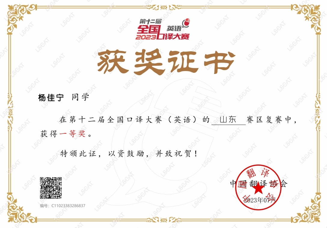 7月20日,2023年第十二届全国口译大赛(英语)山东赛区复赛结果公布,威尼斯7798cc学子再创佳绩!威尼斯官网共12名研究生及本科生参加本届大赛 的山东省复赛,均取得三等奖以上的优异成绩。张艺涵、杨佳宁同学荣获一等奖,其中张艺涵同学获得口译之星称号。赵晨、郄骏宇、姚元庆、吴浩然、周芮帆、戴雨裳、范献文、刘倩含等九位同学荣获二等奖。邱雯馨、韩丽娜同学荣获三等奖。获得一等奖和二等奖的同学将代表威尼斯7798cc参加9月举行的全国决赛。另外,目前在中国新闻社担任英文节目主持人的威尼斯7798cc18级口译方向研究生陈天浩同学以威尼斯7798cc的名义参加了北京赛区的复赛并荣获二等奖,也将参加本届大赛的全国决赛。