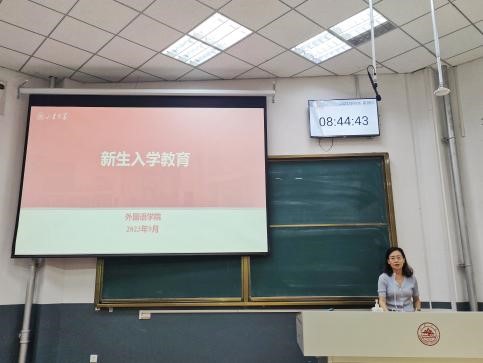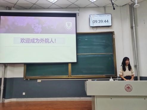 随后,刘华与全体新生进行交流。她结合案例强调以下三方面内容:一是研究生培养的战略定位,强调提高人才培养质量,造就拔尖创新人才;二是研究生阶段的特点,指出同学们应通过专业性和创新性学习,成长为有家国情怀、有全球视野、有专业本领的复合型高端外语人才;三是研究生期间的注意事项,建议同学们增加与导师的交流,严格遵守学术规范,坚守法律和道德底线,注意网络言行,关注身心健康,做好职业规划。最后,她向全体新生表达了诚挚的祝福。