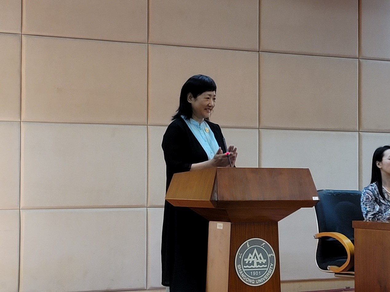 优秀教师代表李彦文老师首先致辞,她向同学们讲述了自己怎样成为了一名“教书匠”的人生经历,并希望同学们拥有丁香花一般朴质典雅的品格,享受“先静下来,再动起来”的大学生活,培养国际视野,掌握无限人生。最后,她强调了师生同在、相辅相成的学习氛围的重要性,展现了作为山大教师扎根齐鲁、胸怀天下的传承精神,始终致力于创新型复合型人才的培养,与同学们一起成长。