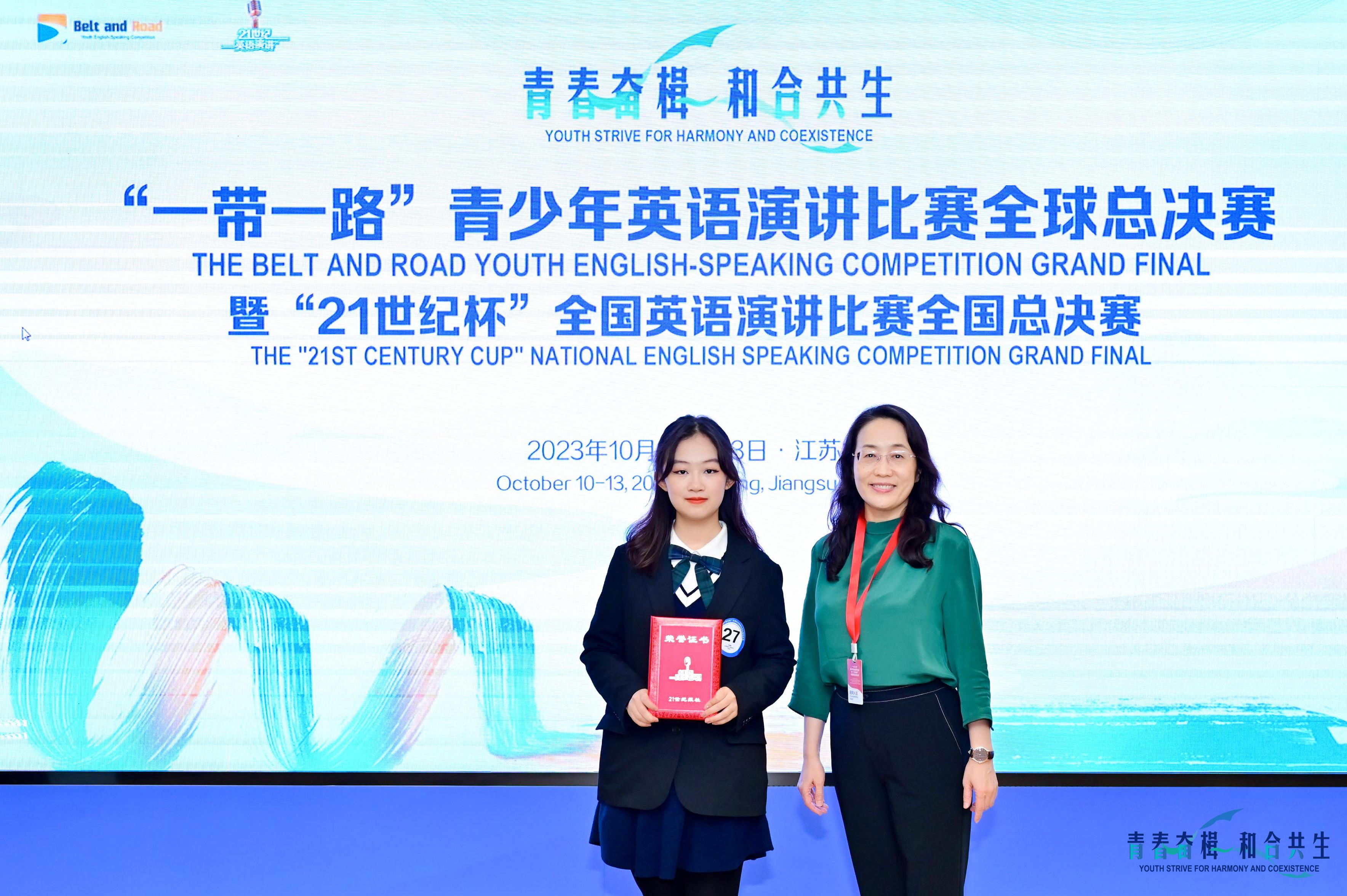 “21世纪杯”全国英语演讲比赛由中国日报社创办于1996年,旨在提高中国青年讲好中国故事的能力水平,为加强我国国际传播能力建设、促进文明交流互鉴、推动构建人类命运共同体凝聚青春力量。赛事于2023年3月入选“全国学科竞赛名单”,属于国家级A类学科竞赛。
