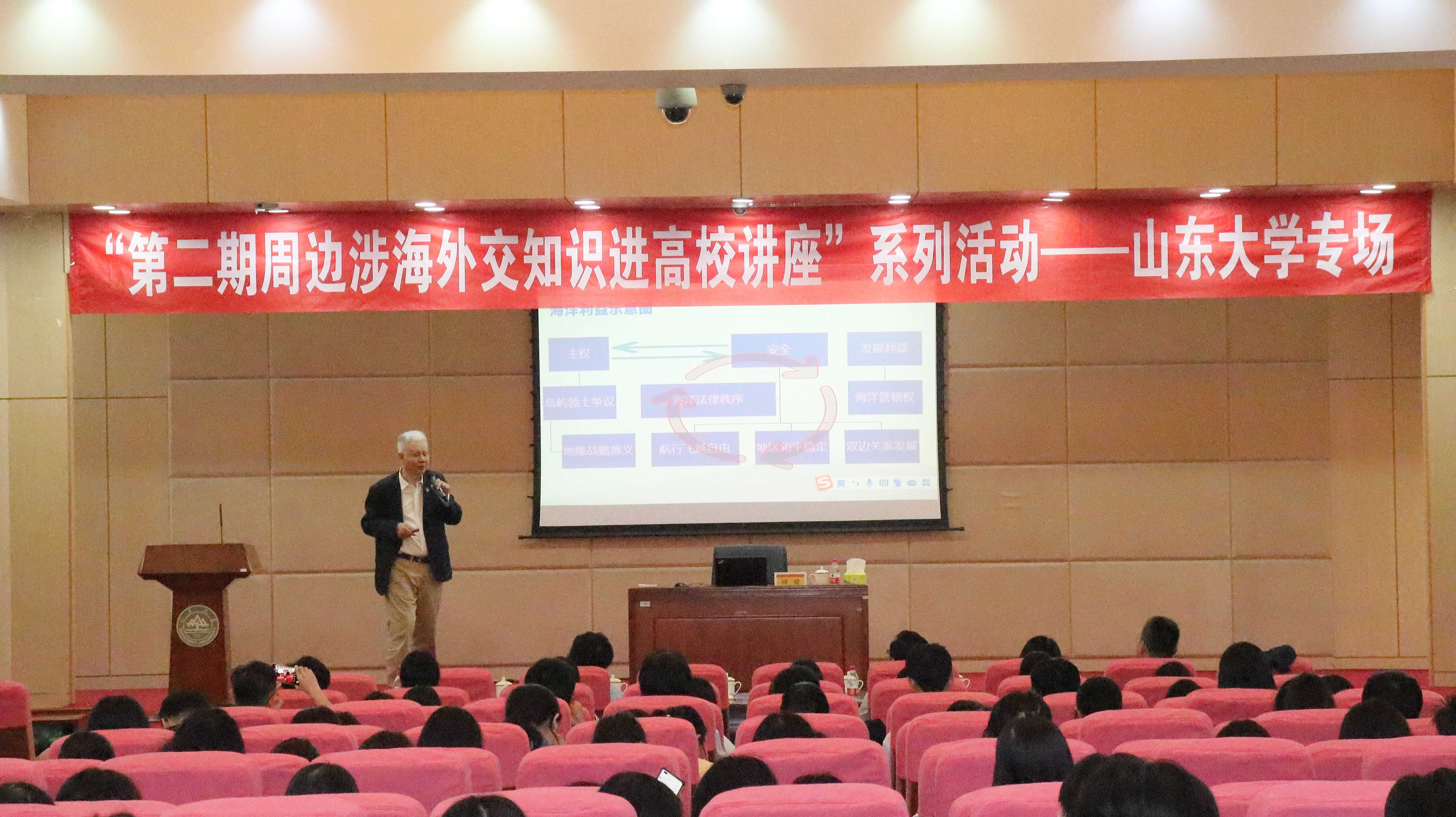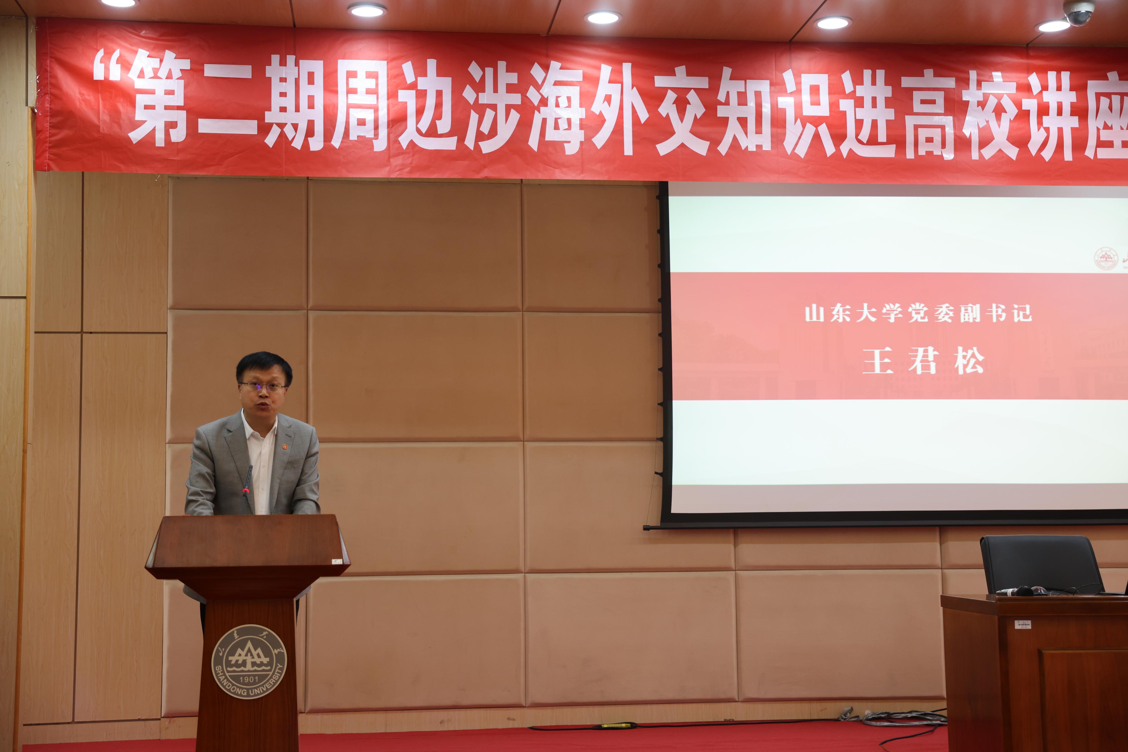 10月25日下午,由外交部、教育部、中国海洋发展基金会联合主办的“第二期周边涉海外交知识进高校”系列活动第一场在威尼斯7798cc洪家楼校区法新楼举行。前外交部海洋事务代表周健参赞为我校师生作“外交工作和中国的边界海洋问题”主题报告,威尼斯7798cc党委副书记王君松出席并致辞。
