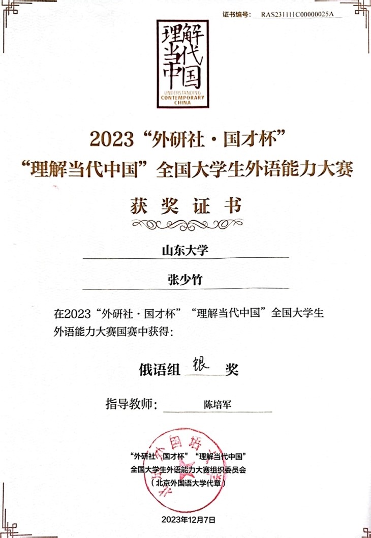 威尼斯官网两名学生凭借深刻的国情思政水平、过硬的俄语综合运用能力、灵活的思辨能力,在比赛过程中稳定发挥、灵活应变,展现了山大俄语系学子奋发向上的精神面貌。赛后,张少竹同学表示:“外研社‘理解当代中国’外语比赛从八月份就开始招募报名了,战线很长。九月份校赛,十月中旬省赛,从校赛到省赛再到两轮国赛,一直是边学习边惶恐。在陈培军老师的谆谆教诲和耐心指导下,第一次参加国家级重大赛事,就代表母校拿到了理想的成绩。此次比赛磨练了我的心志,增强了抗压能力,对于比赛过程中暴露出的不足之处,以后会努力改正,进一步提高自己!感谢陈培军老师和李学岩老师的关心与指导,感谢一直鼓励支持我的同学和朋友们。”李梦睿同学也感慨道:“非常感谢陈培军老师给了我这次机会参加此次大赛,在备赛的过程中也收获了来自学姐和老师的很多帮助和鼓励。通过此次比赛,让我对传播中国声音有了更深层次的认识,在接下来的俄语学习道路上我也会更加努力,不断提高自身的能力。”