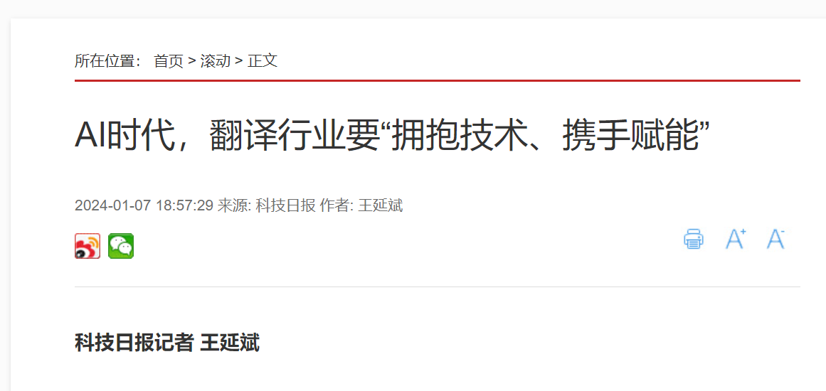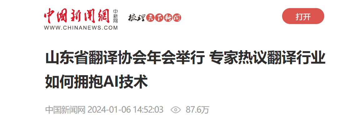 中国新闻网在线刊发图文《山东省翻译协会年会举行 专家热议翻译行业如何拥抱AI技术》,报道翻译专家们就如何拥抱AI技术展开讨论,并强调了AI时代的翻译人才需要具备多种技能,如跨文化沟通能力、人机合作能力、独立思考能力、创新能力等。目前,该报道阅读量已近百万。