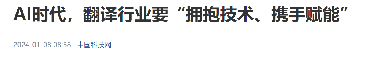科技日报刊发文章《AI时代,翻译行业要“拥抱技术、携手赋能”》。报道引用了山东省翻译协会会长王俊菊提出的“拥抱技术、携手赋能”的口号。文章评价道“在AI冲击翻译行业成为共识的背景下,他们创新谋变、各抒己见,寻求突破之道。”在AI发展日新月异的背景下,翻译从业者要做的是驾驭AI,而不是被AI驾驭,除了传统的译者能力,如文化能力、语言能力之外,译者需要了解并能有效驾驭AI翻译工具,以提高翻译效率和质量。