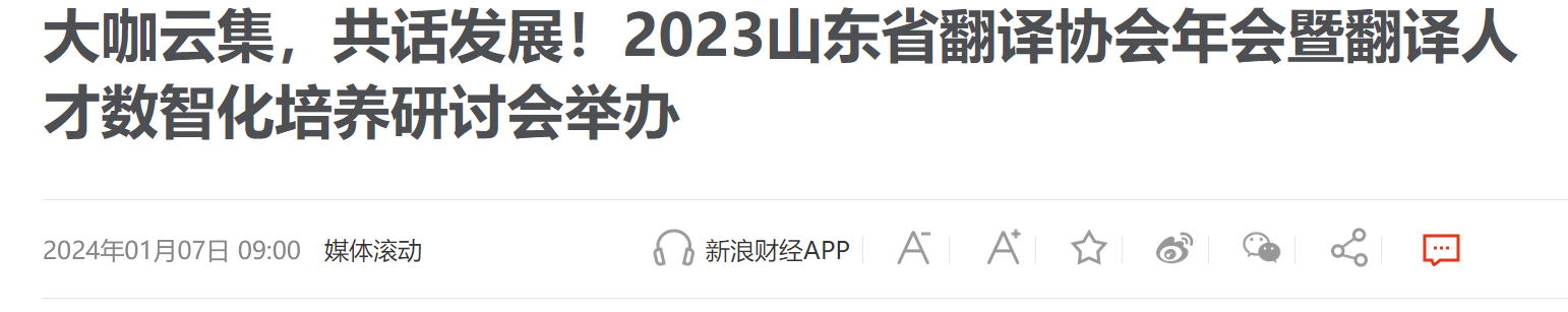 大众网、大众新闻客户端、中国山东网、齐鲁壹点、闪电新闻等山东省主流媒体刊发文章《大咖云集,共话发展!2023山东省翻译协会年会暨翻译人才数智化培养研讨会举办》。报道指出,本次会议聚焦“人才数智化培养”这一核心议题,邀请了来自海内外的多个高校、知名企业的300余位翻译专家、研究人员参与讨论,与会人员深入探讨、集思广益,为翻译领域的发展擘画蓝图。
